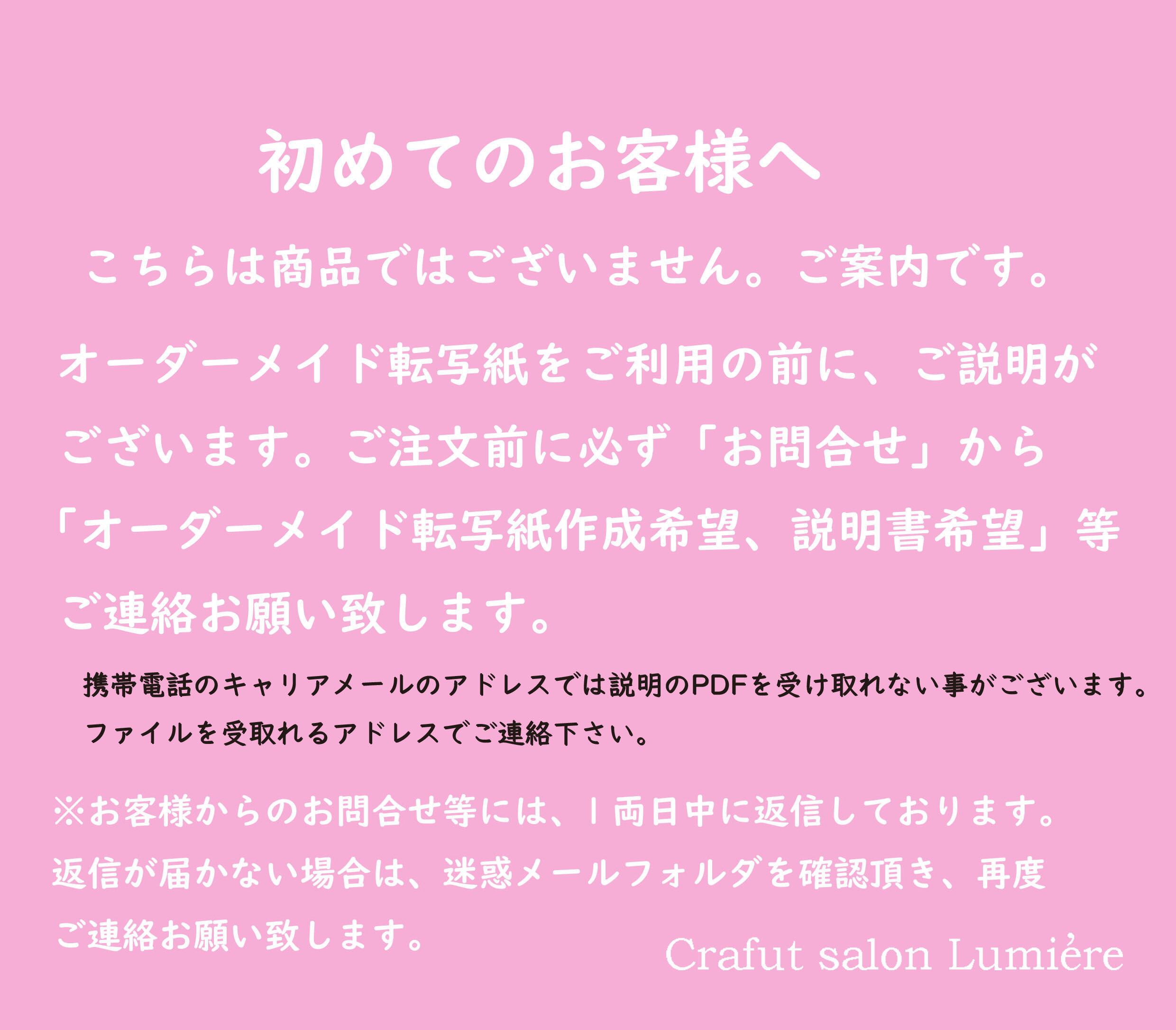 こちらは商品ではございません。ご案内です。(再入荷はございません)初めてのお客様は、ご購入前に必ず「お問い合わせ」から「転写紙作成希望、説明希望」等ご連絡頂きますようお願い致します。※形態のキャリアメールのアドレスでは無く、PDFファイルを受け取れるアドレスでお願いします 転写紙のご注意、ご説明がございます。 初めての方は先にデータの確認が必要です。確認後、問題が無ければご購入頂けますので、先ずはお問い合わせください。